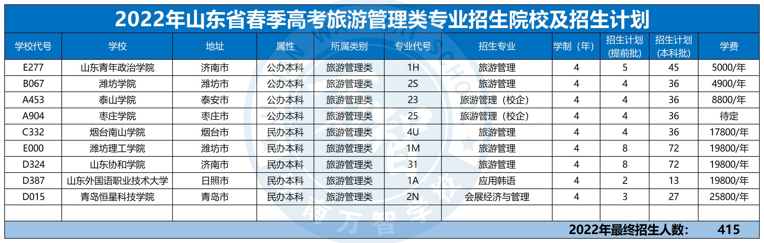 2022年山东省春季高考旅游管理类专业本科招生院校及招生计划